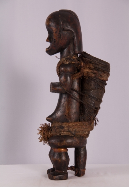 In typical Betsi style, this statue has balanced volumes: the upper and lower parts of the body are relatively equal, with a basket tied to the torso at the center of the configuration. The figure's seated posture and the plinth emerging from the buttocks resembles the original, suited to placement on the lid of the reliquary box, containing the sacred relics (skulls of venerated ancestors) for the ancestor cult.