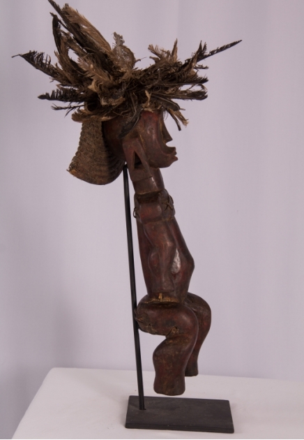This Byeri articulated statue was probably used in a kind of puppet show, performed during the conclusion of the Malan initiation rites, of the ancestor cult. It was a comic show, intended primarily as a respite from the previous days, during which the participants engaged with death. According to L. Perrois, “Performing behind a small raffia screen, these wooden figures were manipulated by initiates seeking to show the new members of the brotherhood that the deceased - represented by the statues, were not really dead, but continue to participate in the life of their descendants in the village. Some statues were articulated, the arms and legs attached to the torso by cords”. The oval head has unusual elements. Especially striking are the head adornments, with a triangular woven headdress terminating in a tuft of feathers at the summit. According to L. Perrois: “The Fang took great care of their appearance at all times, more for symbolic and social reasons than specially aesthetic" . Another unusual element is the very stylish large rectangular ears, with large perforated triangular ear holes.