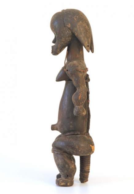 22 This reliquary statue is essentially of the Ngumba style with some Betsi influence, notably the head. Its face is concave and heart-shaped with a protruding jaw, whereas the Ngumba face is full and round. The mouth, however, is in typical Ngumba style - rectangular in shape with its thick lips thrust forward and slightly open to reveal pointed teeth. The headdress is a flat helmet with three thick, flat, stylized plaits (ekuma) and a drilled hole at the base. A small stalk near the buttocks allowed for placement on top of the byeri box. The presence of cords suggests that this byeri statue was probably used as a puppet during Malan rites, when young initiates were shown the skulls of the byeri.