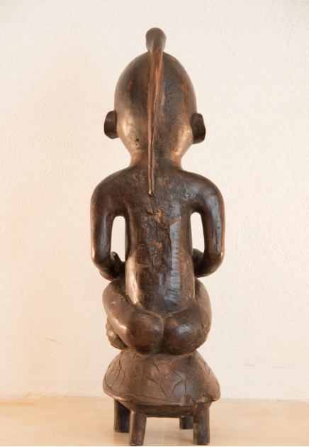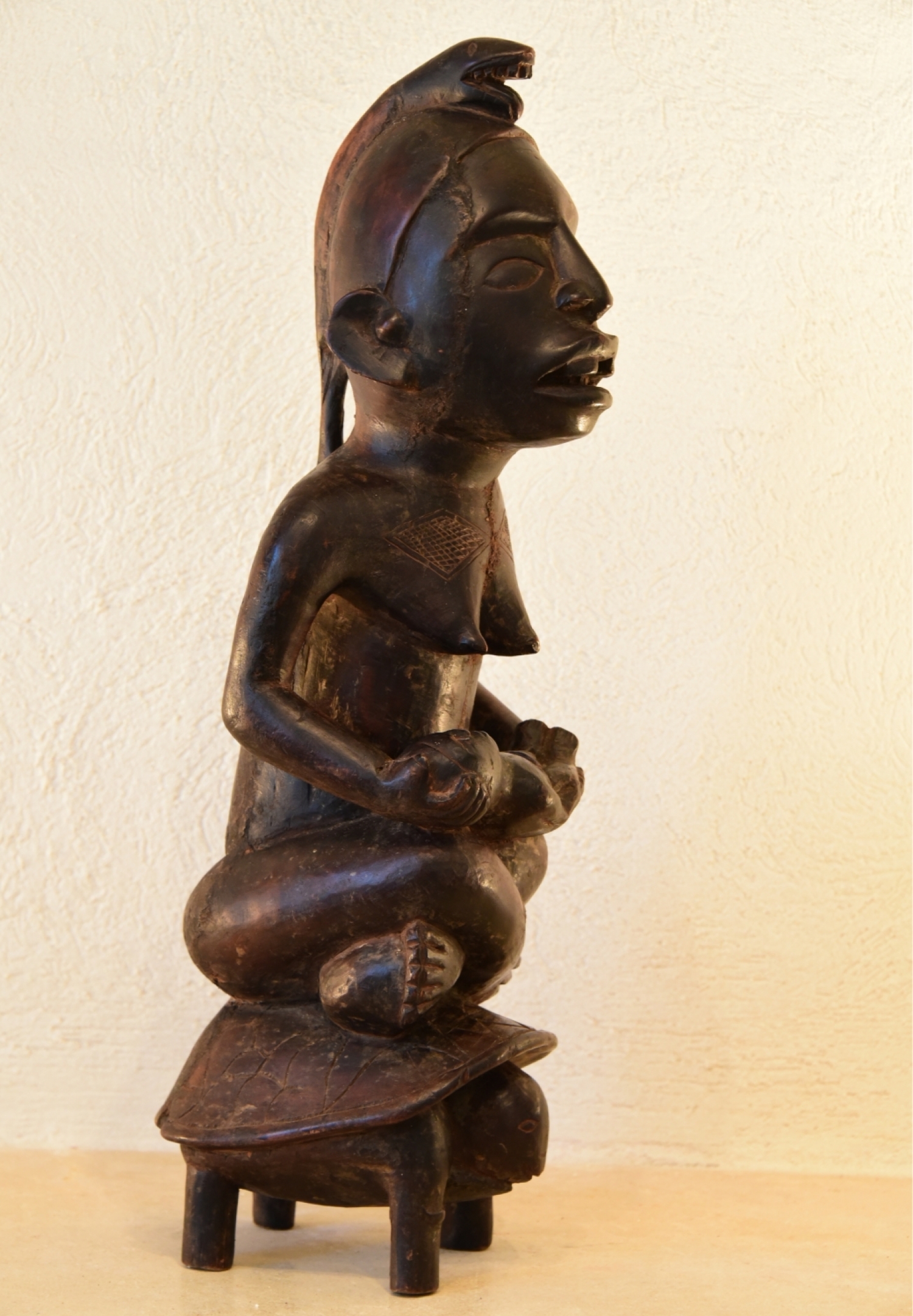 The Yombe are one of several Kongo groups, famous for wood mother-and-child carving.This is a superb example of Yombe sculpture used for fertility rituals. This female figure represents typical Yombe traits: she is sitting cross-legged holding a child on her lap, her head is lifted with an open mouth revealing filed teeth. But this female figure embodied here a gentler spiritual force; she is equipped with two unusual emblems: sitting on a tortoise and holding a snake on her head. The tortoise in Africa is a symbol of old wisdom, cautiousness and prudence, and since it lives on earth and underwater, gives it familiarity with spirits of the otherworld who live in water. The snakes enjoy a special status in Africa, they are believed to have a relationship with spirits, or to be inhabited by spirits, or be spirits themselves. They may be messengers of the ancestors, between the living and the spirit world. (J.Knapperrt, African Mythology 1990:220-1, 244). So this figure is sculptured not only as Maternity figure, but also as seer and guardian of the spirits. "Images of women in ritual contexts and mother and child figures represent more than symbols of fertility, they communicate sexual abstinence, inner cleanliness, ritual purity, female force and spirituality" (Demott, 1998:20).