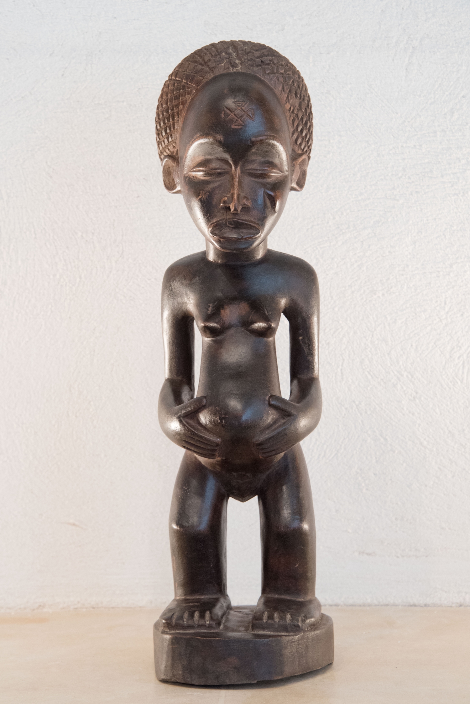 3007 This female figure with a criss-cross hairstyle is admirably modelled, with hands holding her beautiful carved belly, a serene expression on her face with her half-closed eyes, suggesting interior calm and promising hope for pregnancy or good birth. It is evident that although the specific meaning of the images may vary from tribe to tribe, and be associated with ancestors, or divination, they ultimately refer to human fertility and the future of the group that grounded in that fertility. (Warren 1974:386 as cited in R. Sieber & Walker 1987:31).