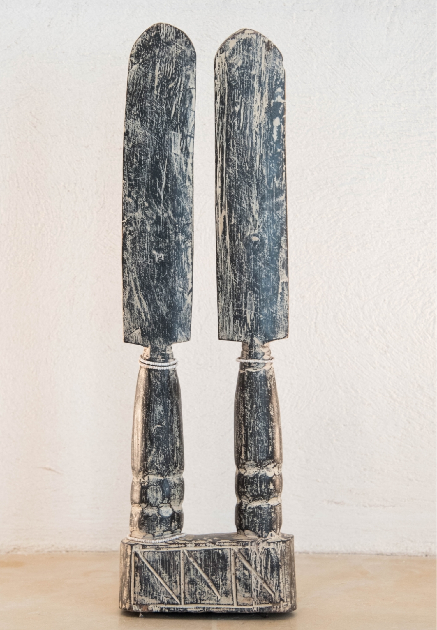 This is a unique Fante akua'ba sculpture, used to honor twins and placate the ancestral spirits. Twins among many groups in Africa (mainly Yoruba, famous for their ere ibeji figures) reflect their parents exceptional fertility. In addition, they are believed to have special access to both the human and the spirit world. Special ceremonies are conducted for and by twins to celebrate their parents' fertility and to encourage the pair to bring abundance, multiple births, to the community. If one twin dies, a small figure is carved to take its place and is given the same treatment as the living twin. As mystical double souls, twins receive gifts, uncommon foods, and protective charms. Several groups also create images to memorialize them or to house their souls when they die (Cole 1989: 85).