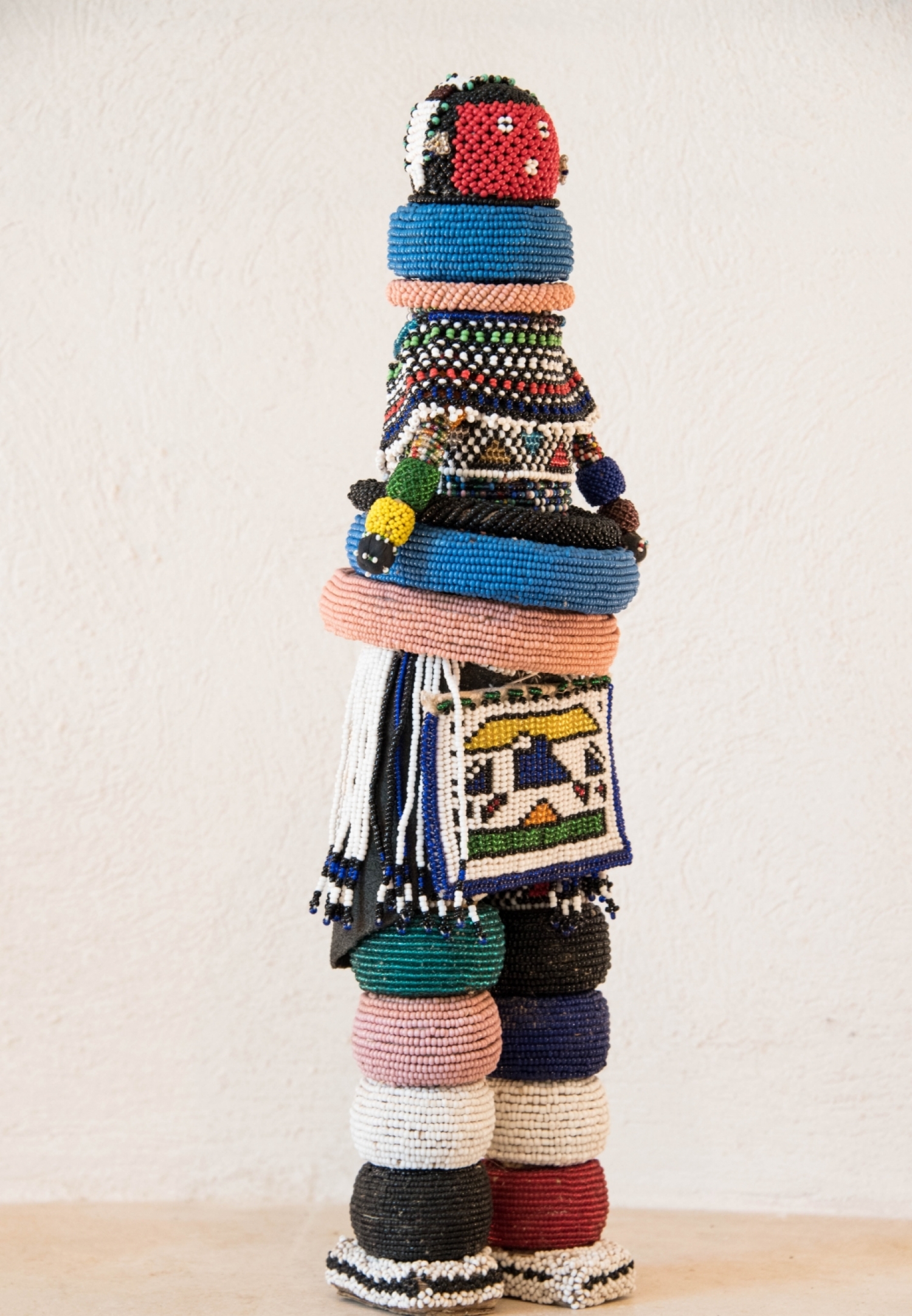 3041 The multiple beaded bands around the fertility doll, duplicate bands made from straw rings covered with beads worn aroun neck, legs, arms and waist of an unmarried young women (Knight & Priebatsch 1983: 18 cited in Cameron 1996:110). This doll represents a young girl, at puberty as wearing ishphephethu - a stiff rectangular shaped beaded front apron.
