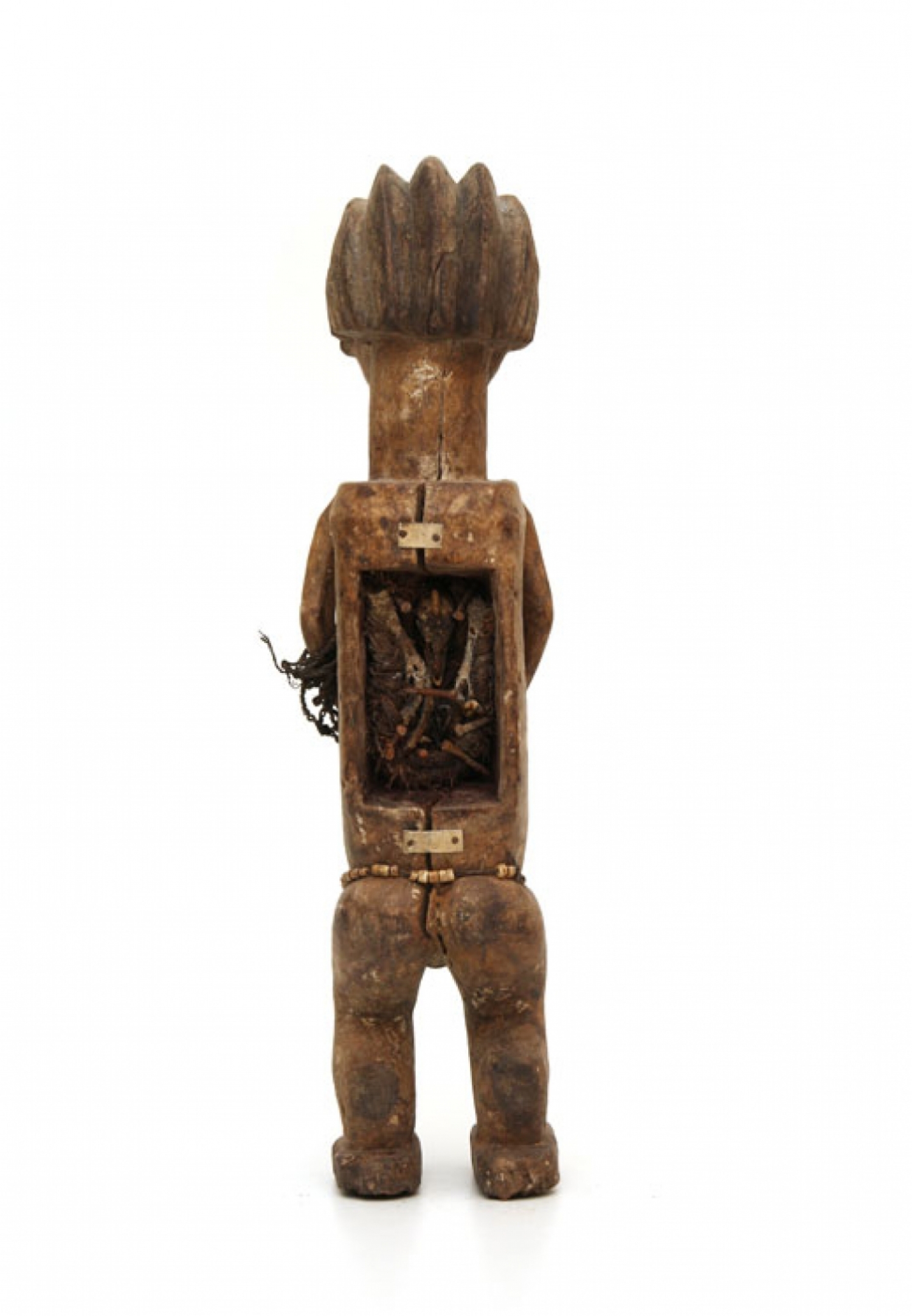This is an exceptional statue. Unfortunately, the door of the figure’s back was missing when I purchased it in Africa, but this is a rare opportunity to discover the mystery of a locked cavity of a reliquary figure. Looking into the cavity at the back, there are a head and two legs of a bird or a chicken, with other ingredients serving probably as a magical potion. And indeed, according to Andre Evens' research from the 1920’s and 1930’s, among Central Mbete there was “an important tradition of relic veneration related to ngoye association, a male cult devoted to hunting, since the hunters played an important role in tribal life". The clan leaders of the Mbete tribe attributed magic powers to their ancestors' relics that were conserved within the hollowed cavity of these wooden figures called mitsitsi-ngoye together with other empowering objects – assisting to bring success in hunting, defense and prosperity in the community’s life” (A. Even cited in LaGamma 2007:276-7).