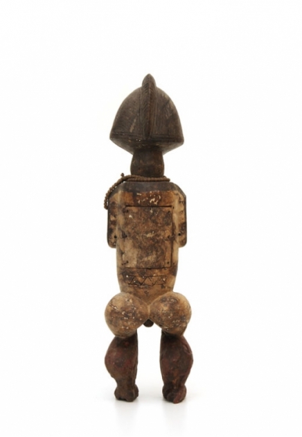 The Mbete developed a sculptural genre that integrated ancestral sacra within a figurative structure. The upper body, as in this statue, is particularly elongated, to enable hollowing out of the back with a box-like cavity. The cavity is covered with a “door” held in place with three threads on either side, two of which are missing here. This cavity usually held small bones of venerated deceased leaders, such as hunters of the ngoye association, since they played an important role in tribal life. These reliquary sculptures were connected with the ancestor cult, assisting in bringing success to hunting, defense and prosperity in community life. This male reliquary figure has all the typical features of the Mbete style: the elongated columnar solid torso which swells at the navel, supported by strong bent legs; the curvature of the thighs and calves is contrasted with black diminutive straight arms, elbows bent. A strong neck supports the typical Mbete head, a lozenge, relatively flat visage with volumetric head, while a broad forehead projects over the lower half of the face. Cowries-shells were applied, forming slitted eyes and the open mouth exposes fine iron teeth. It has the classical Mbete striated hairdo; a prominent crest bisects the coiffure, flanked by carved lateral dense plaits, as incised parallel and diagonal grooves.
